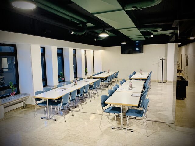 Unsere Räumlichkeiten bieten genug Platz für jegliche Art von Veranstaltungen inkl. Catering! Der Speisesaal hat eine Größe von 200qm und kann optional auf über 300qm erweitert werden. Ob bestuhlt, mit Tischen oder als Freifläche; wir finden die perfekte Lösung für Sie.